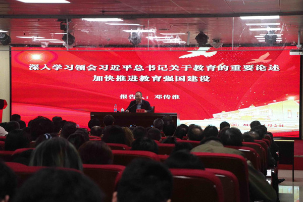 邓传淮以“深入学习领会习近平总书记关于教育的重要论述,加快推进教育强国建设”为主题,紧密结合当前教育现状,重点围绕教育的根本任务、教育的根本问题、全面贯彻党的教育方针、加快建设教育强国、弘扬和践行教育家精神等方面,深入阐释了习近平总书记教育重要论述的丰富内涵和核心要义。同时,他结合自身工作经历,就如何更好地为学、为事、为人和如何做一名忠诚、干净、担当的好干部分享了人生感悟。报告中,邓传淮对我校“忠恕、博学、笃行、致远”的校训给予高度认可,并对学校“六个坚持”等举措给予充分肯定。