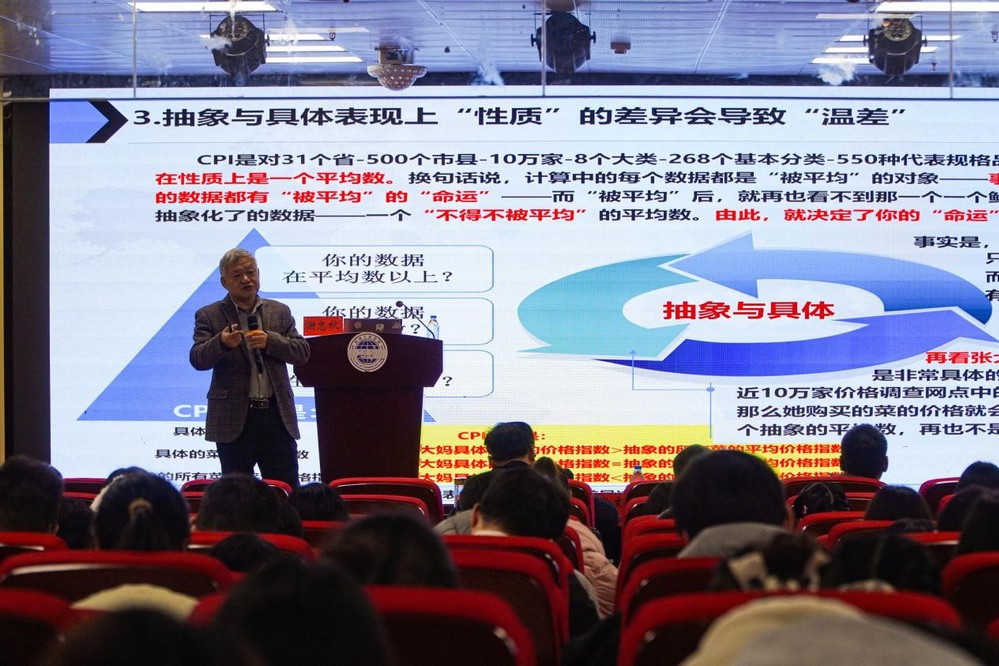 讲座开场,谢忠秋教授从“道法自然”“道法人性”“道法一体”的东方哲学视角出发,引导大家思考宏观规律与微观现实之间的关系。随即他以“买菜”这一生活场景为例,引出主题:为何国家CPI数据显示微降,居民却常感觉物价上涨?谢教授指出,这种宏观数据与个体感受之间的差异,学界称为“温差”,并围绕“是什么、为什么、怎么办”展开系统阐述。